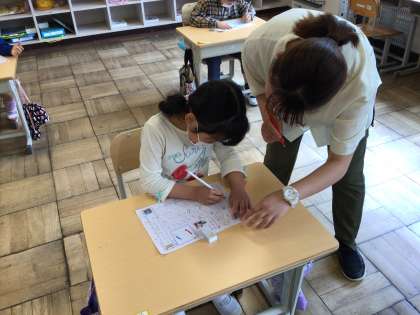 1年生は、かきかたの勉強をしていました。姿勢、鉛筆の持ち方、書き順などに気を付けて書いていました。