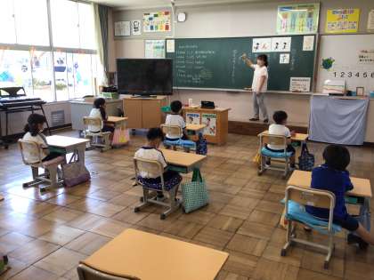 まゆみこども園、もみじこども園の先生に1年生の授業の様子を観ていただきました。