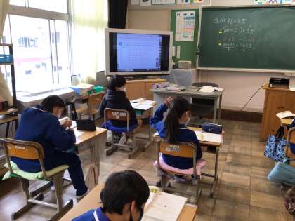 5年生は、きまりのある計算に取り組んでいました。4年生は時間内に正確にたくさん解く練習をしていました。3年生は、引き算のひっ算に取り組んでいました。