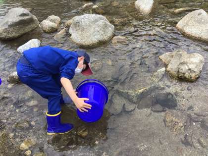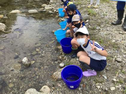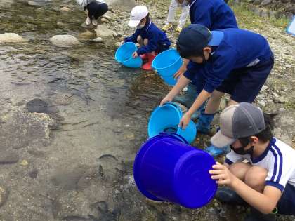 巴川魚協の役員の方が作られている巴川環境保全会の方に1、2年生が稚鮎の放流体験をさせていただきました。