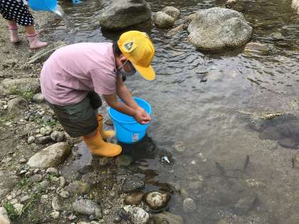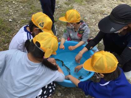えびやさんの下の川でたくさんの稚鮎を放流しました。