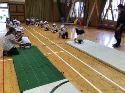 1年生は、体育の授業でマット運動をしていました。柔軟体操を行った後、前転に挑戦していました。