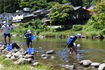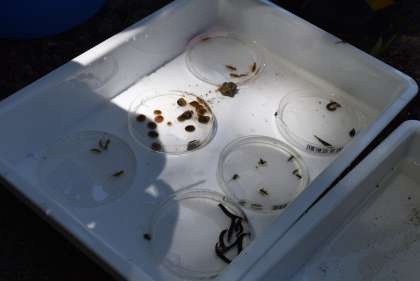 2グループに分かれて、ヒラタドロムシ、ヨシノボリ、カワゲラ、トビケラ、コオニヤンマの幼虫など、たくさんの種類の生物を採取しました。がんばりました。