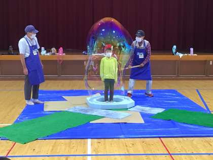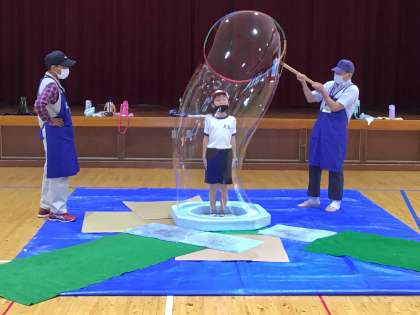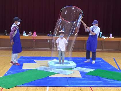 昨日に続き、1、2年生シャボン玉づくりに挑戦しました。今日は、大きなシャボンだもの中に入りました。
