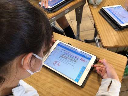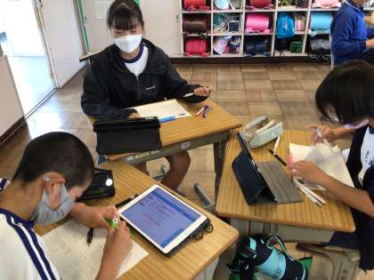 6年生国語では、投稿文の読み比べをしています。学習用タブレットを使って、自分の意見と一致する内容に青、理由は緑、工夫は赤の線をひきながら読み、グループで意見交換をしました。
