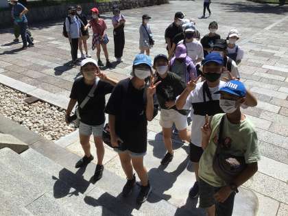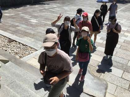 法隆寺につきました。鯛石を踏んで門をくぐります。