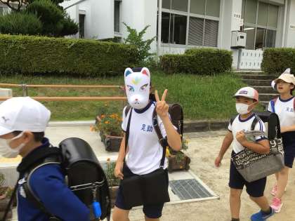 ランドセル姿のキツネはとっても可愛いです。くれぐれも気をつけて帰ってくださいね。