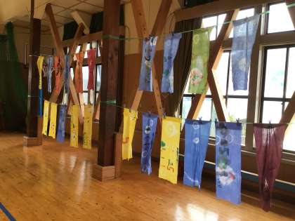 150周年記念誌DVDの撮影2 公開日 2022/09/16 更新日 2022/09/16 校長室から 7月に作った染め物を講堂に飾り、ドローンで撮影してもらいました。このDVDは記念誌についてきますので、楽しみにしていてください。