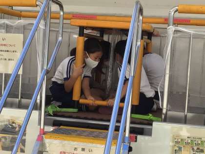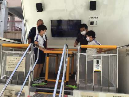 1、2年生は震度6弱、3、4年生は震度6強、5、6年生は阪神淡路大震災「震度7」程度で実際の揺れを再現したものを体験しました。