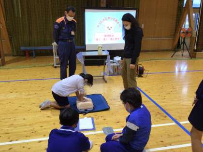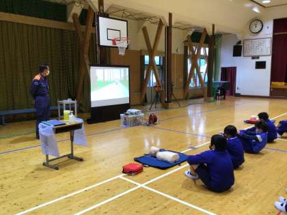 応急手当講習 公開日 2022/10/06 更新日 2022/10/06 お知らせ 豊田市消防力石出張所から講師の方を招いて、5年生が応急手当講習を受けました。とても真剣に話を聞いたり、心肺蘇生の実習をしていました。