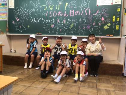 運動会の朝、1年生ははじめての運動会にわくわくです。2年生は昨年度の担任からサプライズメッセージ。