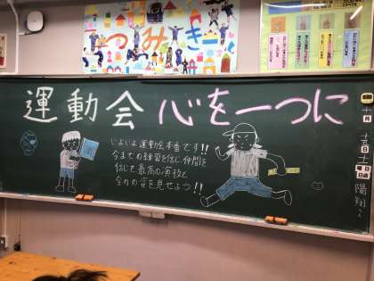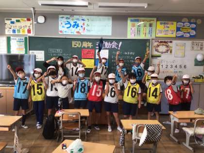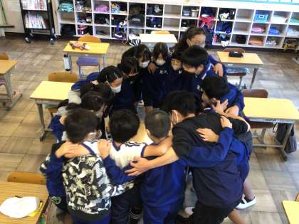 5年生も円陣!4年生は、もう外に出てしまっていました。3年生も頑張る気持ちでいっぱいでした。