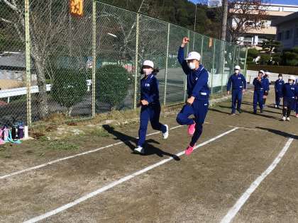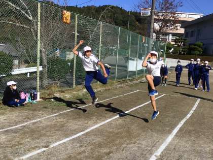 幅跳びと鉄棒の練習をしていました。写真は、3歩目でジャンプしながら走る練習の様子です。