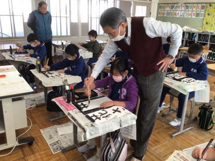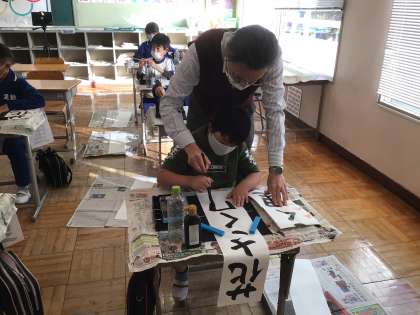 書き初め大会に向けて、書道の先生に来校いただきました。今日は4、5年生が教えていただきました。