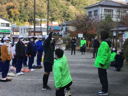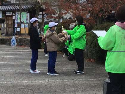 香嵐渓で駅伝大会をしました。開会式では昨年度の優勝トロフィーが返還され、6年生による選手宣誓が行われました。