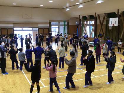 踊りを覚えたら、大きな輪になり、歌声に合わせて踊りました。「っとこどっこい どっこいしょ」の掛け声も入れて、楽しく踊ることができました。