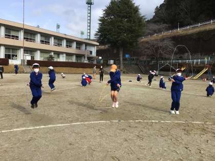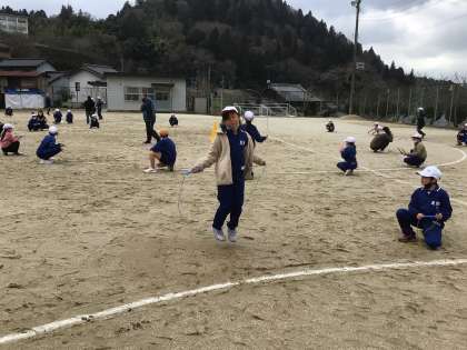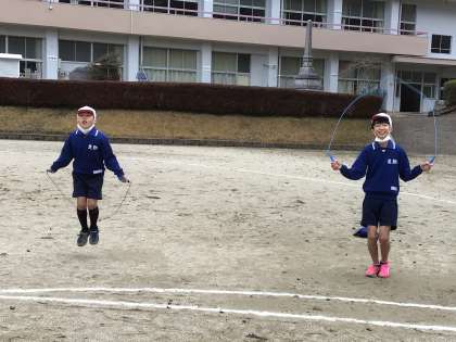 縦割りチームで時間内飛び続ける競技やあや跳び、二重跳び、駆け足跳びなどで競いました。