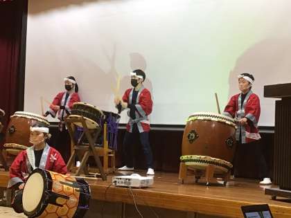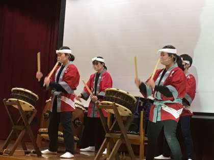 在校生と卒業生の編成で三州足助太鼓を演奏していただきました。力強さと躍動的なリズム、見ている私たちを魅了しました。