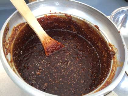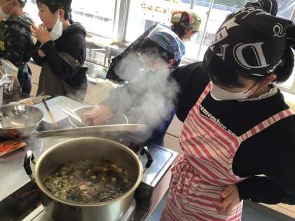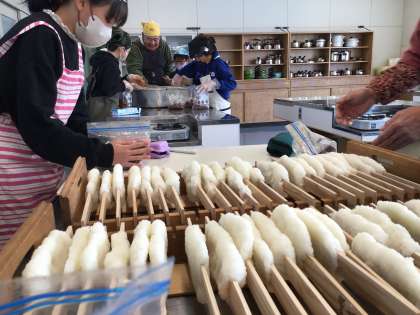 五平餅は、潰したご飯を板につけて、あとは味噌をつけて焼きます。個性的な形の五平餅になりそうです。