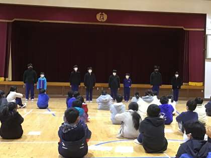 スピーチ発表は今年度は今日が最後でした。おしゃべりタイムは引き続き行います。朝会の最後に校歌を歌いました。今日の伴奏は、5年生児童のデビューです。