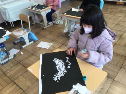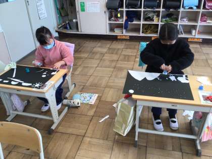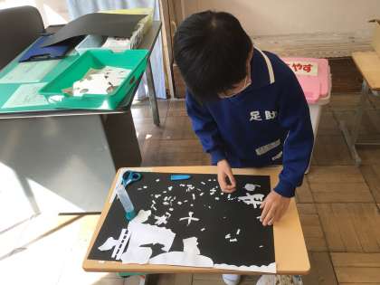 2年生図工では「ハサミでアート」の作品を作っていました。
