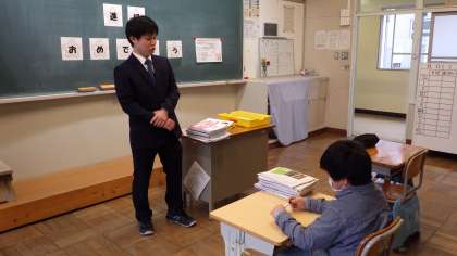 入学式後の学級開きの様子です。後ろ姿です。