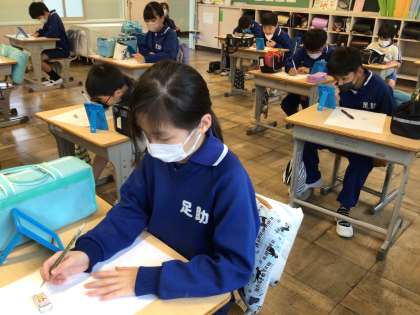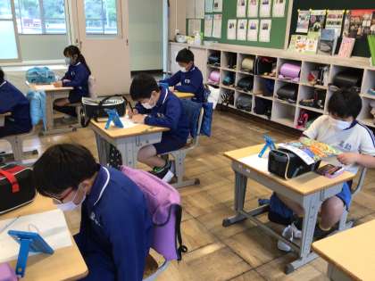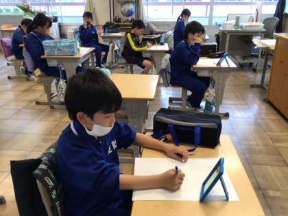 4月12日(水)、机の上に鏡を置いて、自分の顔を見ていたのは5年生です。
