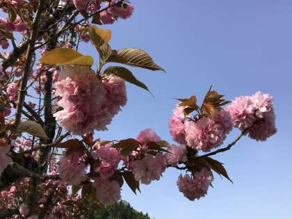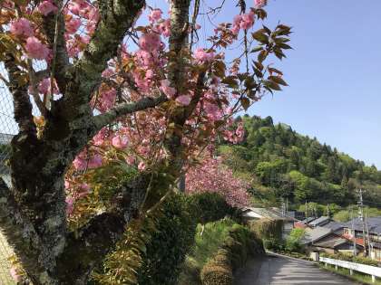 八重桜 公開日 2023/04/14 更新日 2023/04/14 校長室から 4月14日(金)、とても早く咲いてしまった今年の桜ですが、校門坂の八重桜は、まだ咲いてくれています。緑の葉も出てきた中に、ピンクのもこもこした桜の花が咲いている様子を見て、「桜餅みたい」と言ってくださった方がいました。おいしそうに見えてきました。 飯盛山の緑は濃くなってきました。