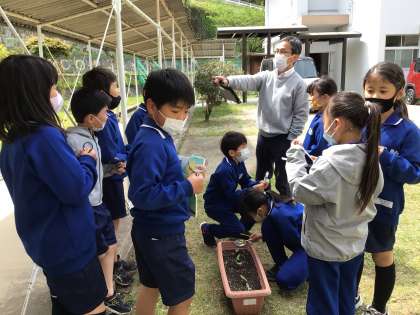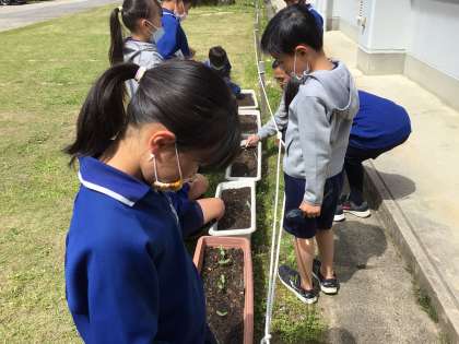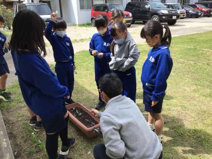 3年生 理科 子葉 公開日 2023/04/24 更新日 2023/04/24 各学年から 4月24日(月)、3年生が以前まいた、オクラやヒマワリなど種の芽が出たので、観察です。ものさしで測ったり、よく見て発見したりしたことを、新しく習った「子葉」と言う言葉を使って発表していました。