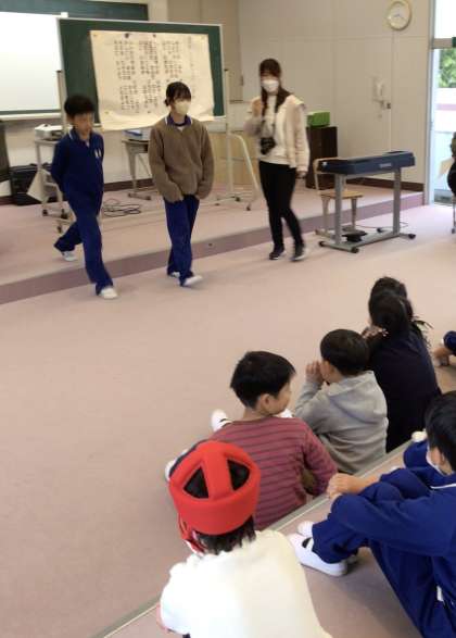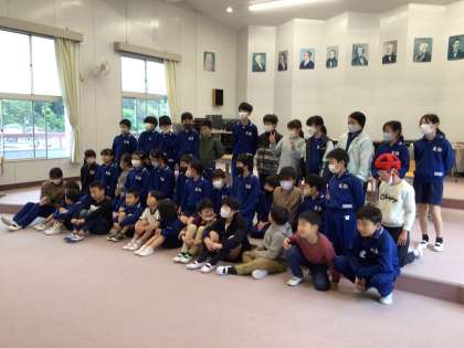 白組は、音楽室です。そろって、団長の決意を聞きました。 それぞれの団結力で、競い合いましょう。