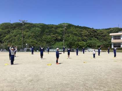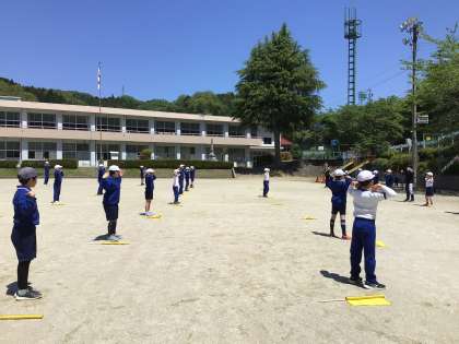 5・6年生 ラジオ体操 公開日 2023/04/27 更新日 2023/04/27 各学年から 4月27日(木)、運動会に向けてラジオ体操も練習しています。 体育委員は、前でお手本を見せます。 昨日の雨から一転の青空。周りの緑が濃く見えます。
