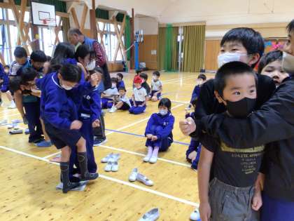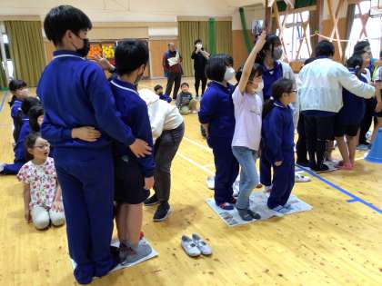 次のゲームは、新聞ジャンケンです。負けたら、新聞紙を折っていきます。全員が乗れなくなったらアウトです。