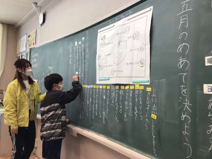 5月1日(月)、4月の振り返り、5月の目標をみんなで話し合っていたのは、6年生です。