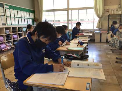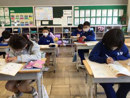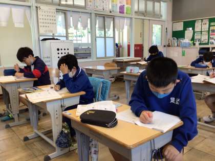 5月8日(月)、4年生は算数で折れ線グラフをかいていきます。縦軸、横軸をよく見て、印をつけています