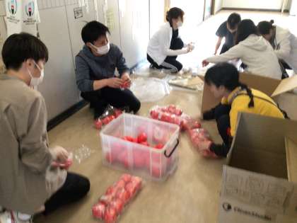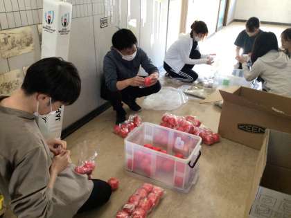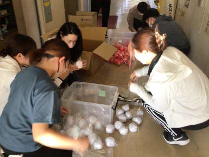 5月11日(木)の下校後、新しい玉入れの玉を準備している先生方です。おろしたての玉で、明日、練習します。