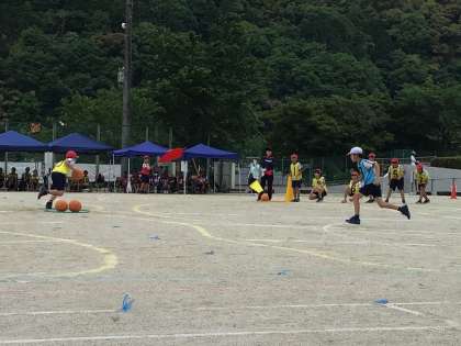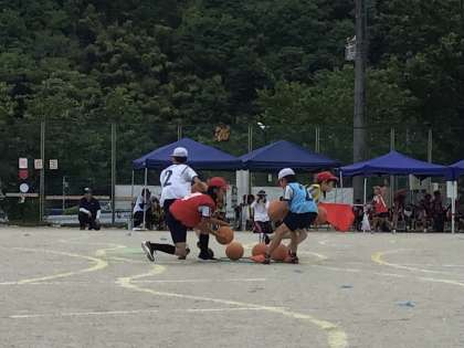 運動会 手に入れろ ドラゴンボール 公開日 2023/05/21 更新日 2023/05/21 学校行事 5・6年生の競遊は、頭も体も使います。知らないうちに、3個のボールが集まります。 黄色チームが2回、赤チームが1回、青チームが1回3個のボールを集めました。勝敗は、集めたボールの数で決まります。16対17で白組の勝ちとなりました。