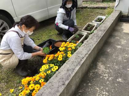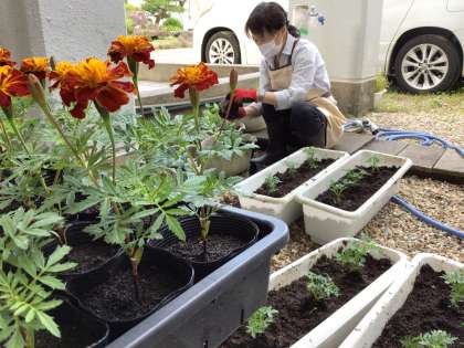 5月31日(水)、午前中に届いた苗を、公務手さんたちが雨が降る前にと、午後早速植え付けしてくださいました。丁寧なお世話のおかげで、夏の花が学校をにぎやかに彩ります。