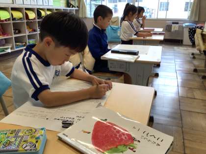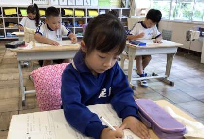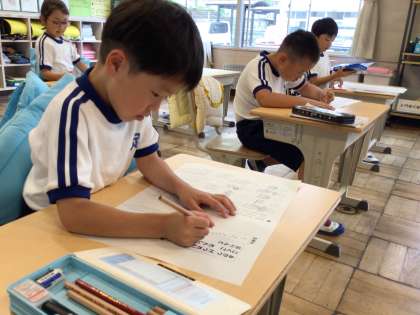 5月31日(水)、国語の授業の終わりに、初めての月例テストに向けて練習する1年生。いい顔です。