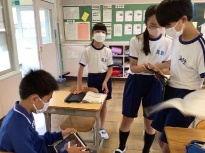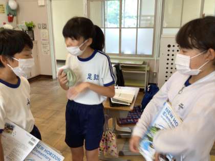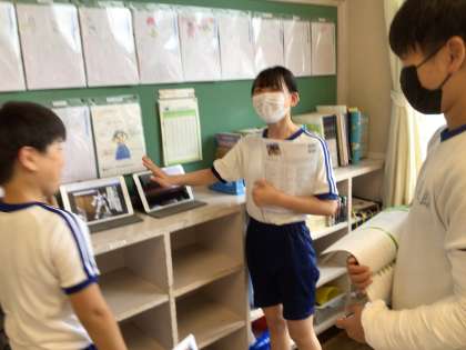6月14日(水)、英語での会話を練習しています。最後に質問して、それぞれの宝物を当ててもらいます。わからないければ、ヒントを出してもらいます。答えが当たると、「That's right」タブレットで撮影してきた宝物を見せて、にっこりです。