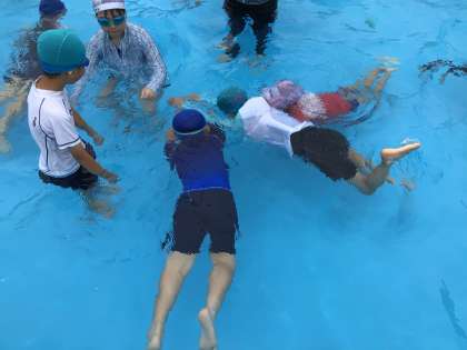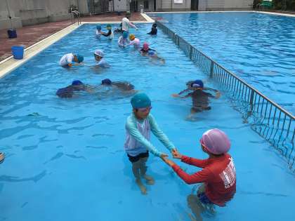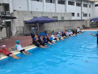 6月21日(水)、低学年は顔をつけて、鼻から息を出してみました。頭までプールに入って、鼻から水を出すと、ぶくぶくと泡が上がってきます。体の力を上手に抜いて、クラゲになっている子もいます。