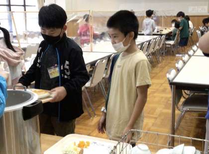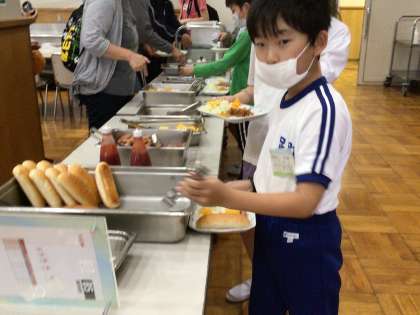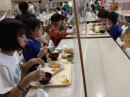 食べたいものがお皿に並びました。班で揃って「いただきます」