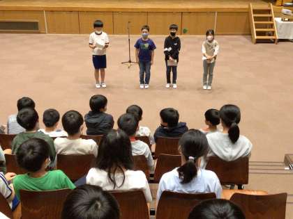 5年 キャンプ2日目 退所式 公開日 2023/06/23 更新日 2023/06/23 各学年から 退所式では、代表の子たちが、心に残ったカレーづくりやスタンツのことなどを話しました。そして、出会った友達と仲良く、協力できた喜びや中学での再会への楽しみを語る子もいました。 充実した2日間でした。旭高原で目標にしたスマイルを、各校で広め、生かしましょう。