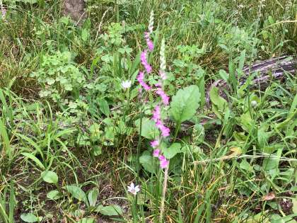 講堂前にネジバナが咲いています。かわいいピンクの花がねじねじして、立ち上がっています。