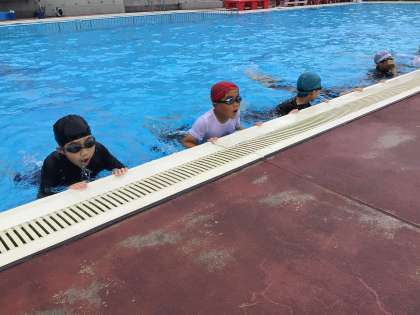 7月5日(水)、5・6年生は平泳ぎを練習しています。ブクブクパッ息継ぎをプールサイドで繰り返してから、ビート板をお腹に抱え、ラッコの姿勢で足を動かしてみます。そして、次にはビート板の上に乗り、手足を動かしていきます。最後はビート板なしで、息継ぎと手足のタイミングを合わせます。だんだん体を伸ばして進む時間が長くなり、平泳ぎに近づいてきました。