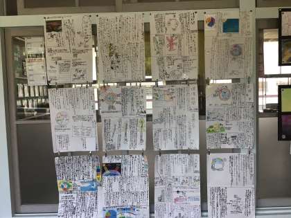5年生教室前に、それぞれがまとめた環境新聞が掲示してあります。今後の世界について考えさせられます。