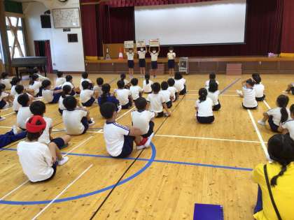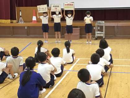 全校朝会 体育委員会から 公開日 2023/07/10 更新日 2023/07/10 特別活動 全校朝会で、体育委員会が計画した全校遊びについてお知らせしました。 4色対抗王様ドッジボールだそうです。13日(木)、暑くなりすぎないことを願っています。
