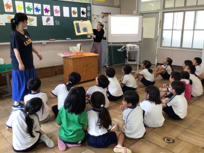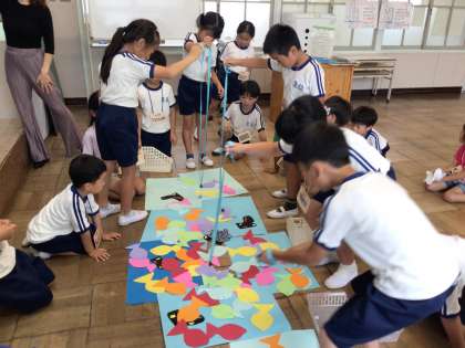 1・2年 ALTの先生と 色の英語 公開日 2023/07/14 更新日 2023/07/14 各学年から 7月14日(金)、絵本「にじいろのさかな」を英語で話してもらった後、英語で言われた色の魚を釣るゲームに挑戦です。5チーム対抗戦で、たくさん魚を釣り上げました。