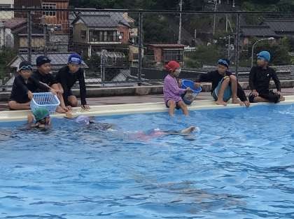 7月19日(水)、3・4年生も今日がプール納めです。 4色対抗宝探し、下まで潜るのが大変です。