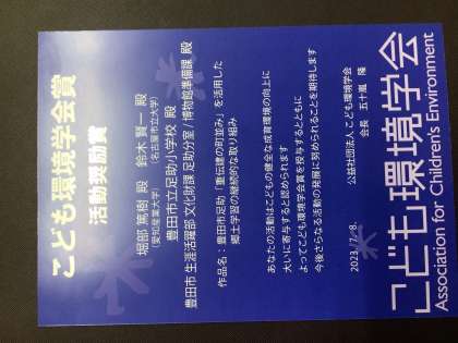 足助小学校が10年に渡り取り組んできた「重伝建」の学習活動が認められ、こども環境学会賞 活動奨励賞をいただきました。学習をずっと支えてくださっている堀部先生をはじめとするみなさんのおかげです。ありがとうございました。