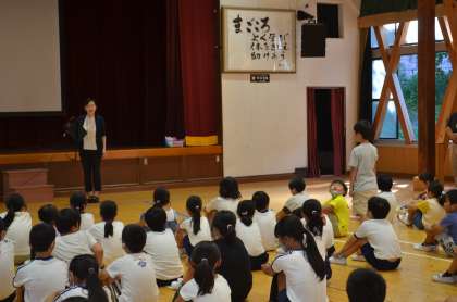 また、8月に5年生代表が参加した豊田市リーダーシップトレーニングセンターの様子を紹介し、自分から気づいて、考え、行動することを9月から「TAKE ACTION」として、どんどん取り組んでいこうと伝えました。9月からの一人一人の活躍が楽しみです。
